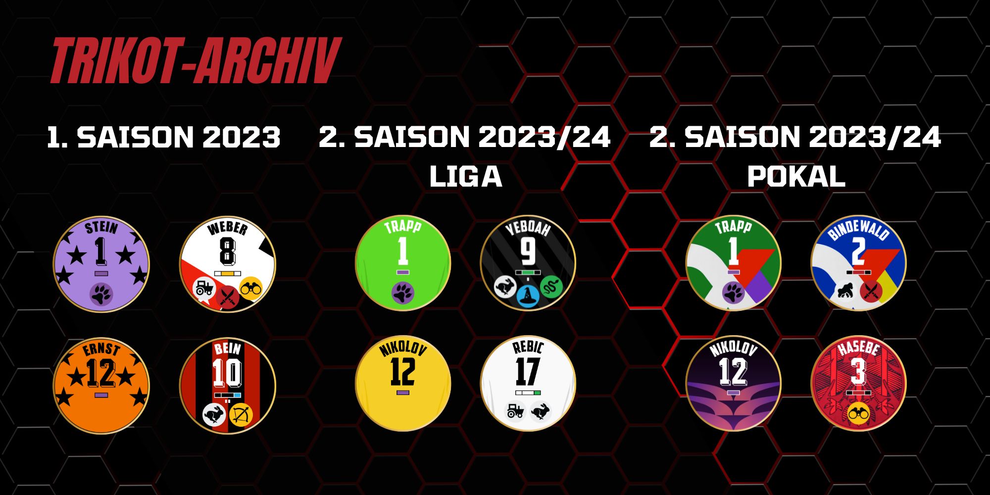 | Nummer | Name | Spitzname | Heimtrikot | Auswärtstrikot | Startaufstellung | Kapitän | Tore | |